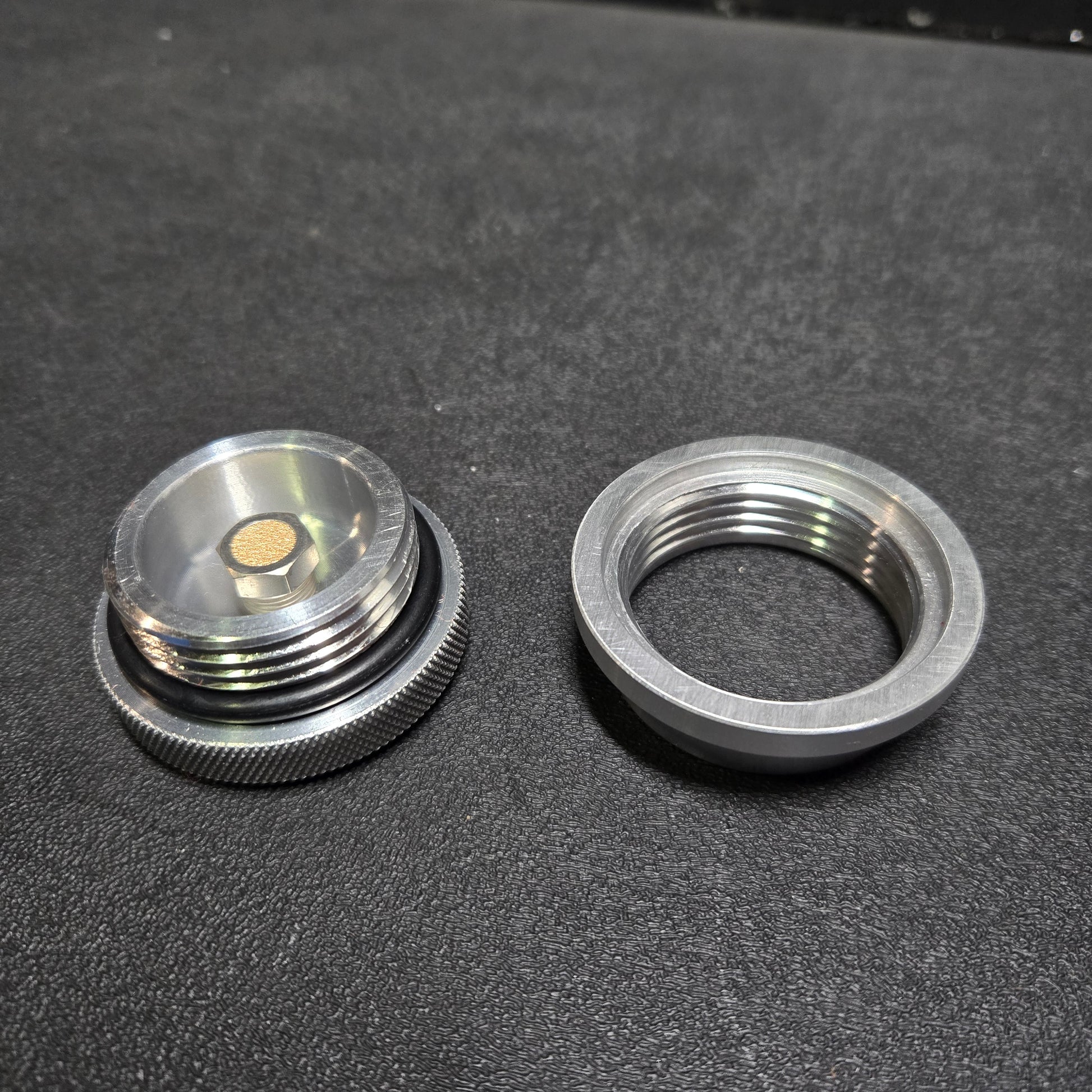 Kloc Fabrication proprietary cap & bung assemblies are machined from 6061-T6 aluminum. They feature heavy knurling on the fill cap, O-ring seat in bung with a temperature/chemical resistant O-ring, and a thick outer diameter for ease of welding to your project. Stainless steel vent fitting allows for venting of both suction and pressure.